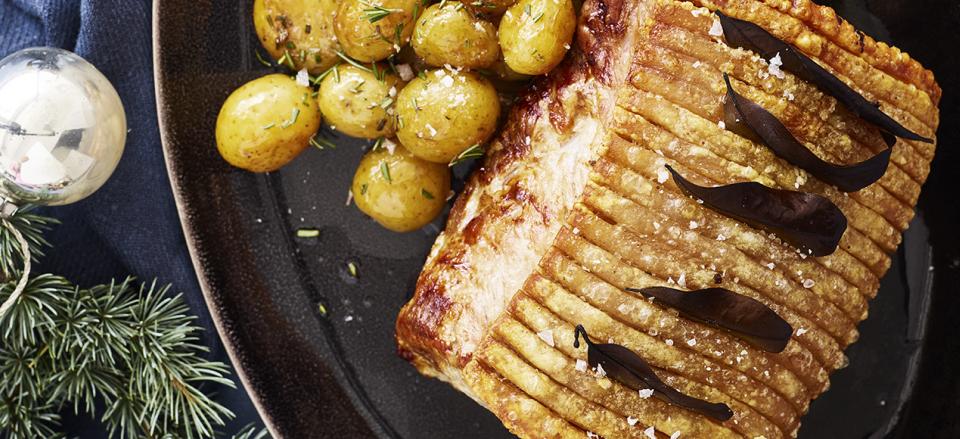 Langtidsstegt flæskesteg med rosmarin-karamelkartofler og portvinssauce