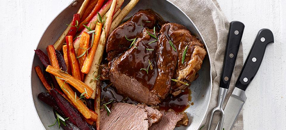 Langtidsstegt oksegrydesteg i øl med bagte rodfrugter