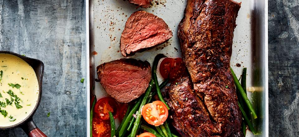 HjemOpskrifterLangtidsstegt oksemørbrad med bearnaisesauce og grønne bønner i vinaigrette