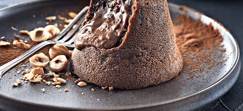 Lav en lille hulning i hver form med en ske, og kom ca. 2 tsk. nøddecreme i kagerne.
