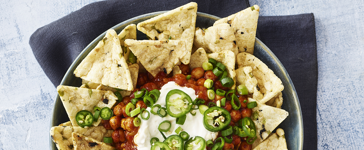 Loaded nachos med spicy kikærter