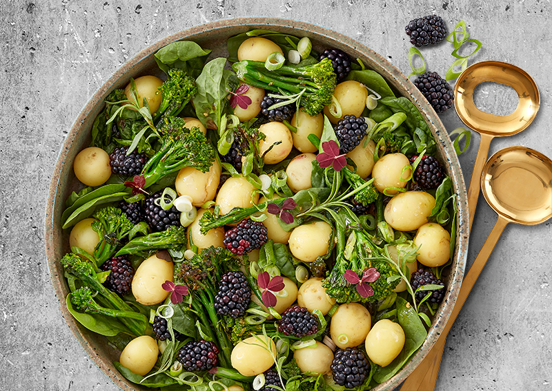 Lun kartoffelsalat med brombær, forårsløg og aspargesbroccoli