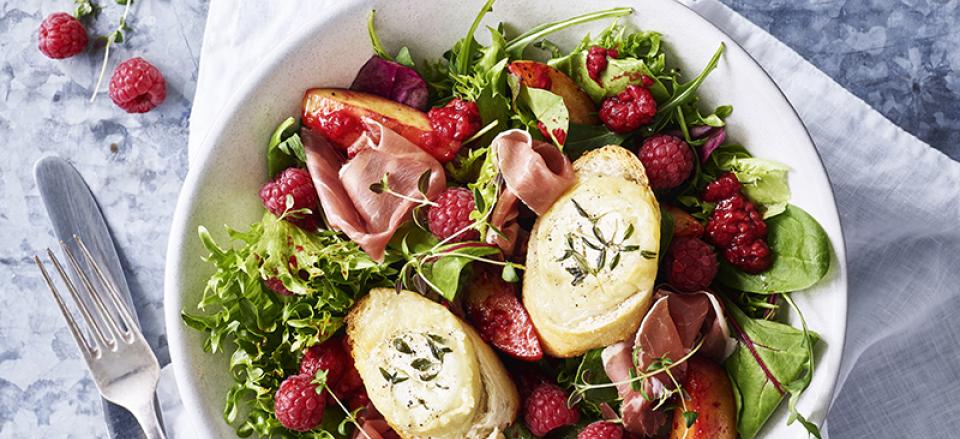 Anret salaten med skinke, lune ferskener eller nektariner og hindbær, og kom de varme ostebrød på.