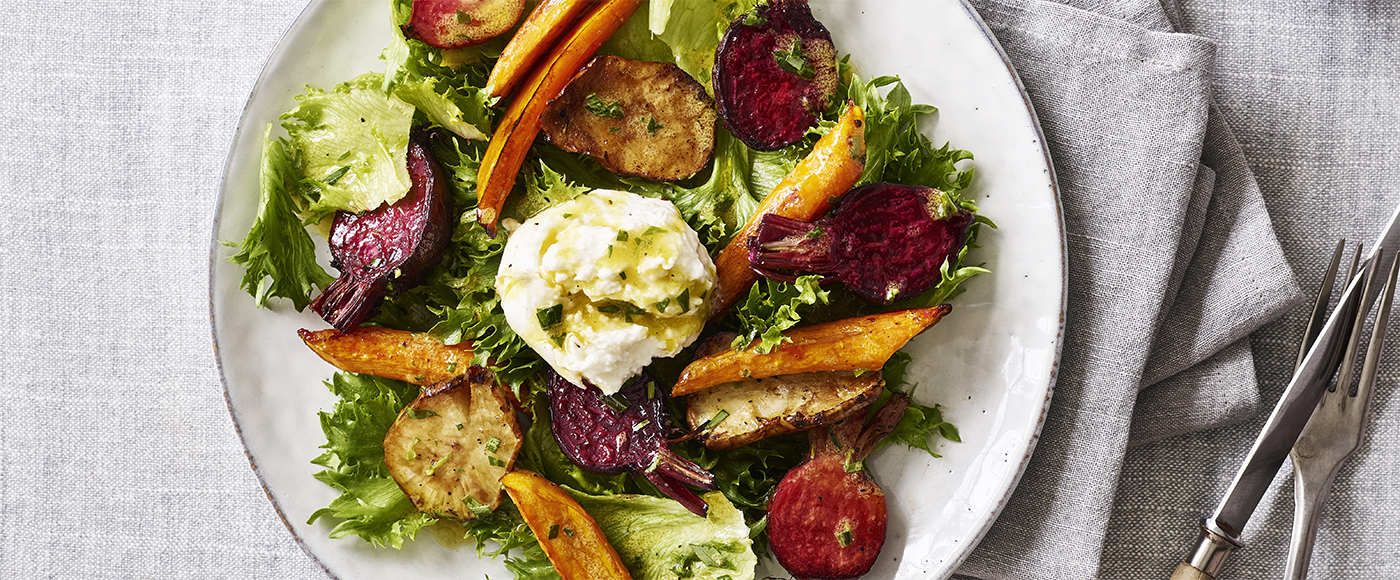 Lun salat med balsamicoristede rodfrugter, mozzarella og estragonvinaigrette