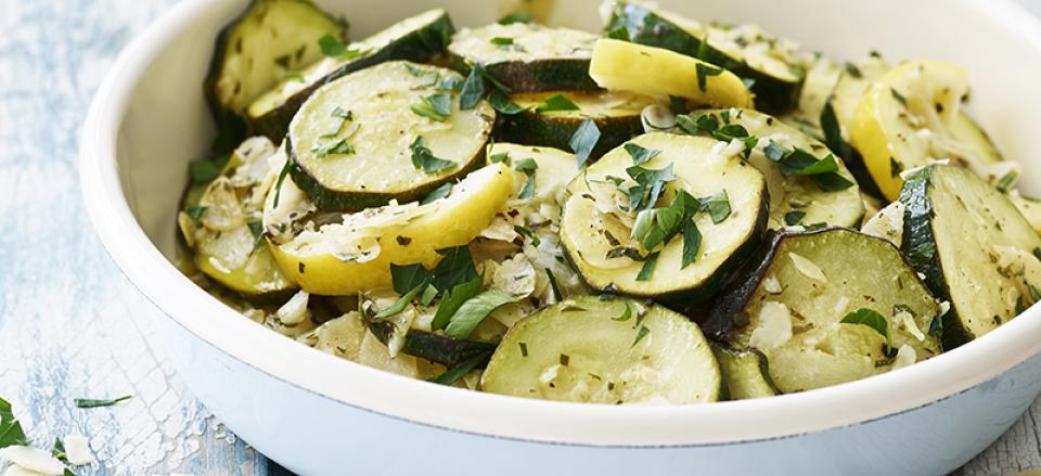 Varm olien i en stor pande og steg courgetterne sammen med citron ved middel varme i 10 min, mens der vendes i dem.