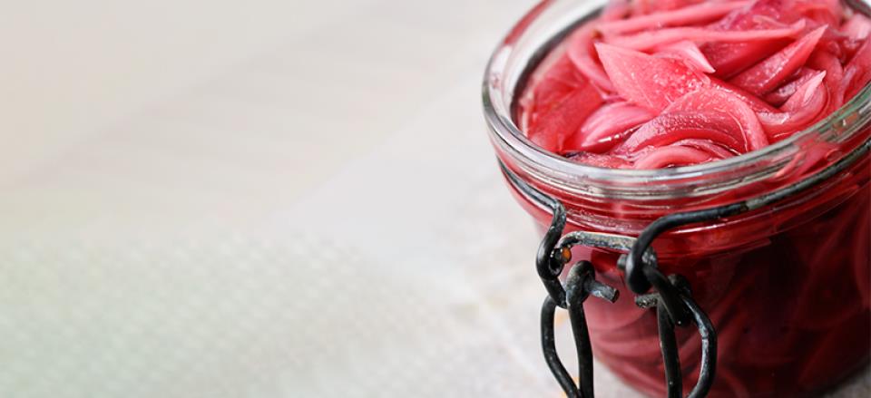 Skær rødløgene i tynde skiver og kom dem i et skoldet glas.