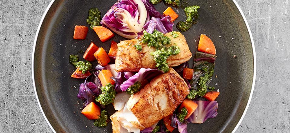 Anret søde kartofler blandet med spidskål, smørstegte stykker af lyssej og grønkålspesto på 4 tallerkener.