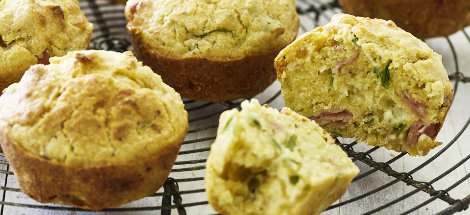 Skær forårsløg i tynde skiver, og skær emmentaler og skinke i tern – kom begge dele i melblandingen.