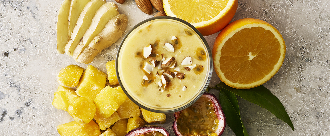 Mandelsmoothie med appelsin, mango, ingefær og passionsfrugt