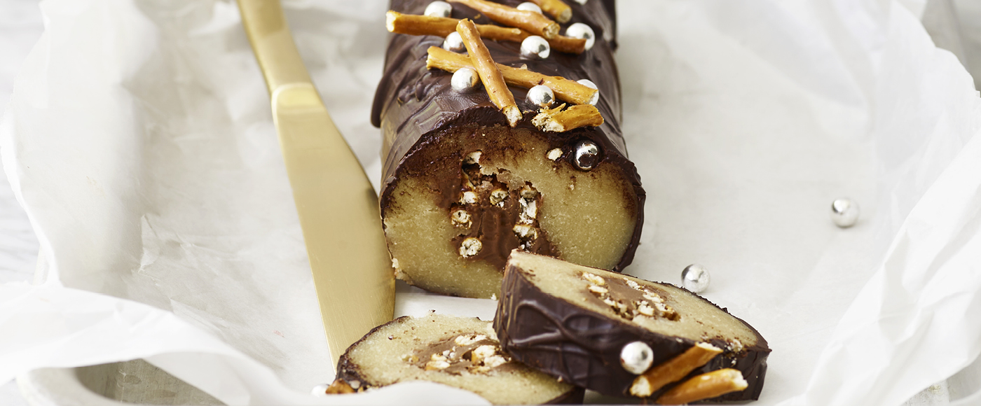 Smelt overtrækket, og pensl det på marcipanrullen.
