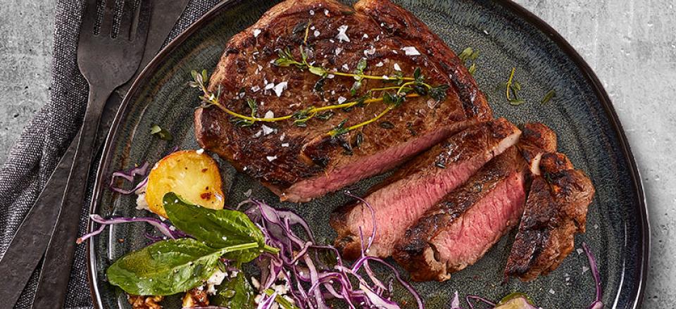Marinerede kalvekoteletter med lun grøn kartoffelsalat