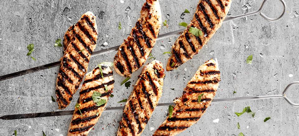 Marinerede kyllingeinderfileter på spyd