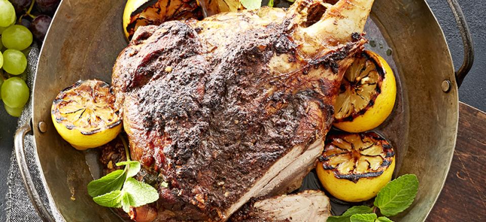 Skær rustikke stykker af den saftige kølle, anret gerne med lamme sky, grillede citroner og frisk mynte.