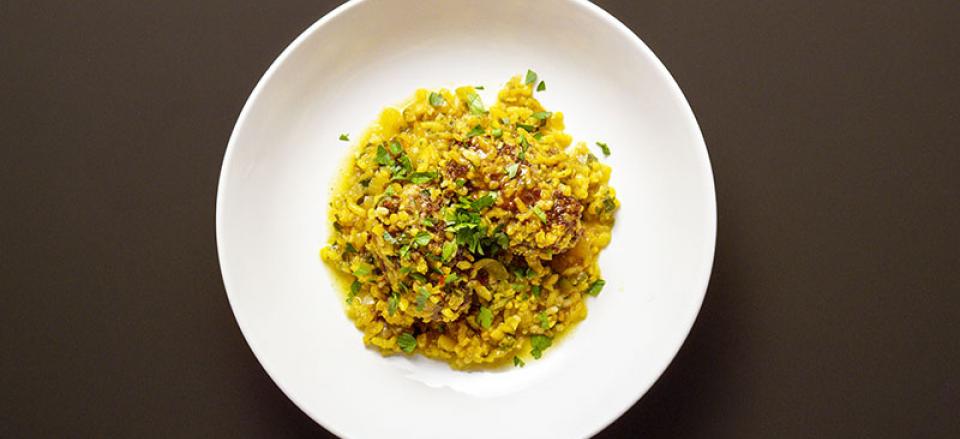 Kom begge dele i gryden sammen med safran.