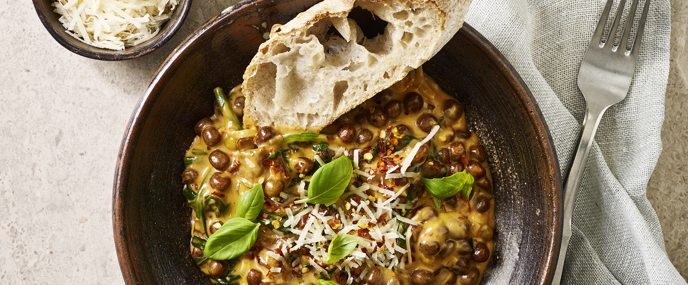 Tilsæt fløde og spinat og kog retten færdig i 10 minutter.