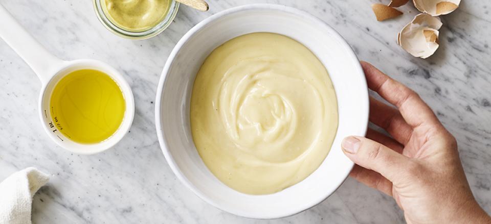 Tip: Er du nervøs for, at mayonnaisen skal skille, kan du tage æg og sennep ud af køleskabet en time før, det skal bruges, så det har samme temperatur som olien.