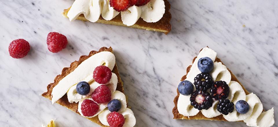 Kom cremen oven på kagen – brug evt. en sprøjtepose – og pynt med bær.