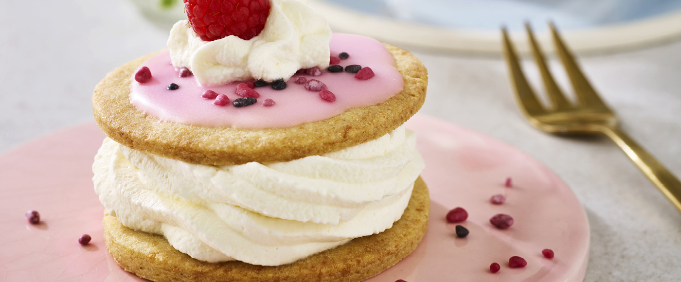 Medaljer med marcipan, flødeskum og hindbær