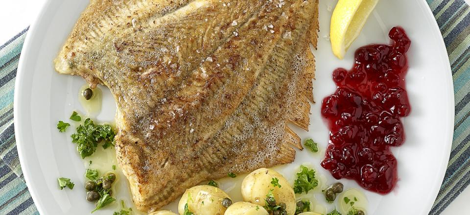 Menuierestegt rødspætte med smørsauce og tyttebær
