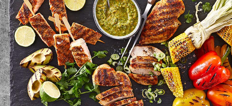Anret laksespyd, kyllingebryst, grillede grøntsager og Salsa Verde på et stort fad eller bræt.