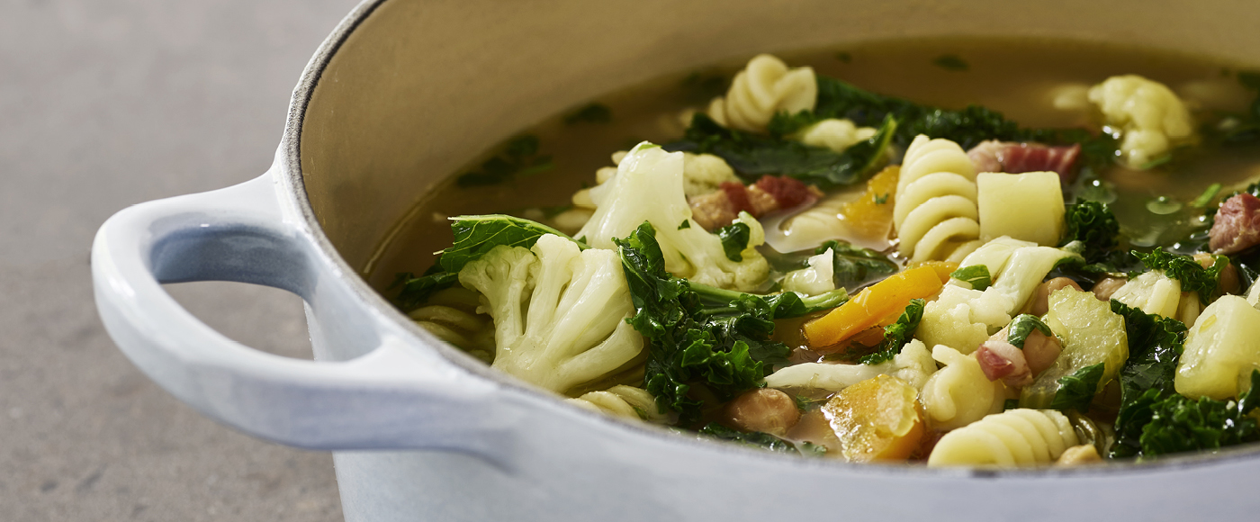 Minestrone med kål, pancetta, kikærter og pasta