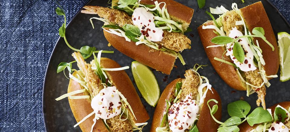 Del hvert brød i to, så du får otte mini-hotdogbrød, og kom kålsalat og en reje i hver.