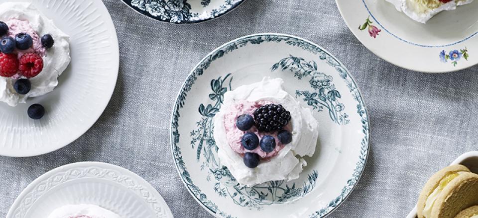 Lad marengsen køle ned og pynt dem med fromage og friske bær.