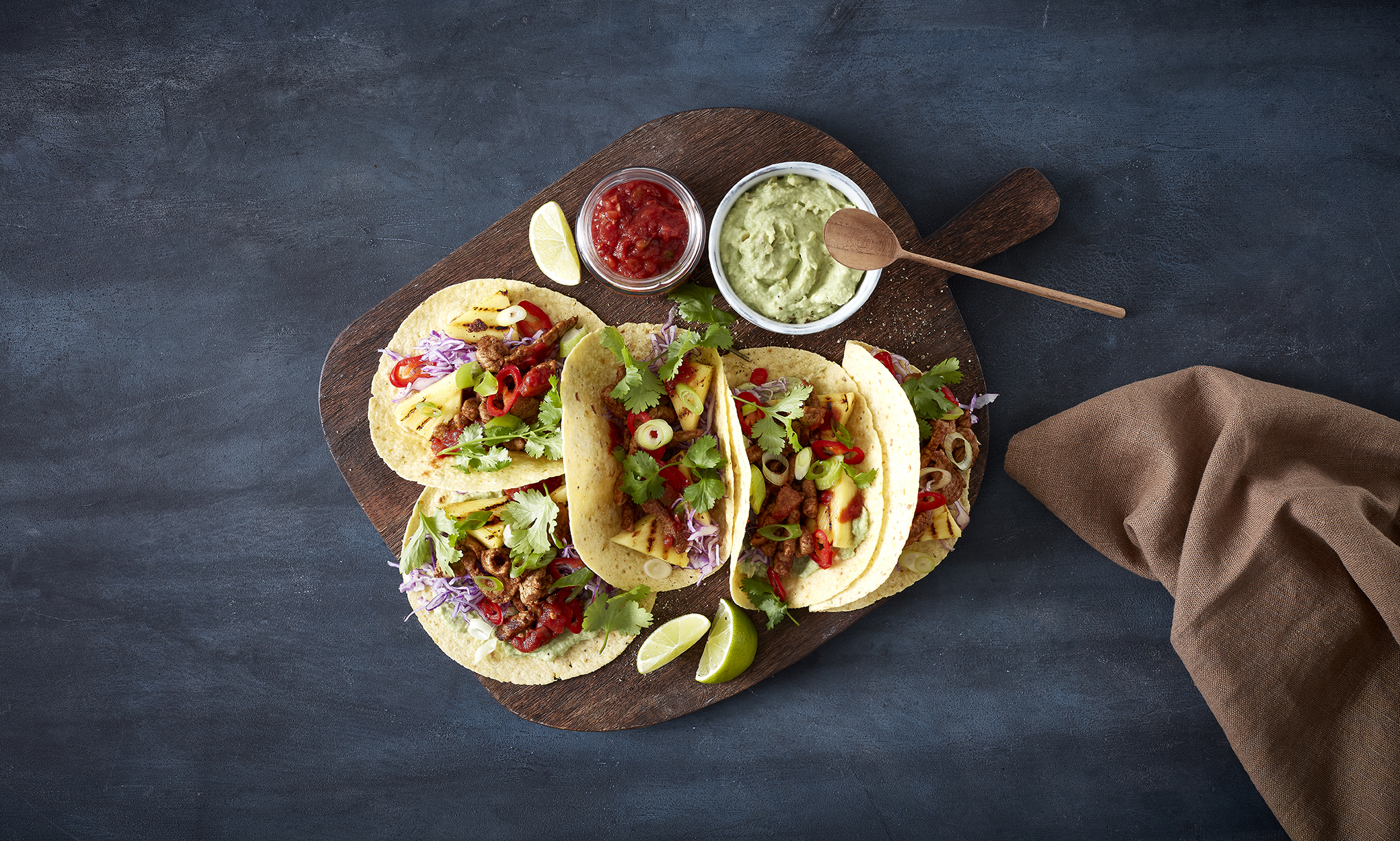 Mini-tacos med mørbrad af gris, kål, grillet ananas, guacamole og tomatsalsa