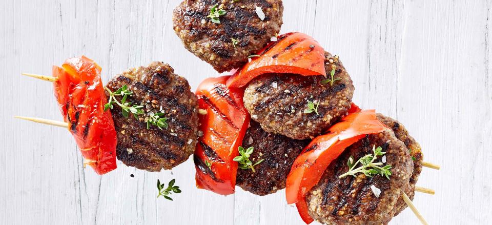 Anret med 2 spyd igennem hver, skiftevis mini hakkebøf og rød peber.