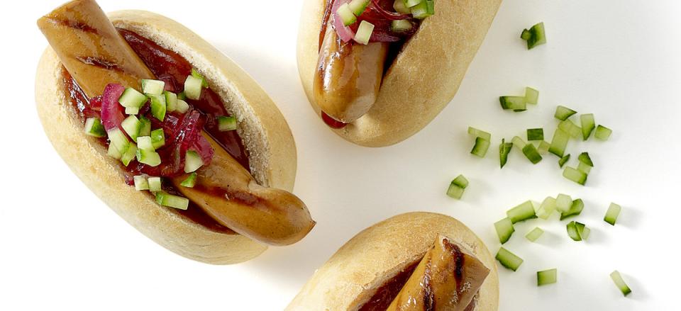 Kom 1 tsk. ketchup, ½ varm pølse, agurketern og 1 tsk. syltet rødløg på toppen.