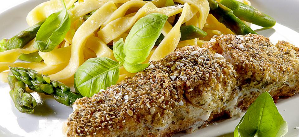 Server mørksejen med pasta og asparges, pynt evt. med friske krydderurter.