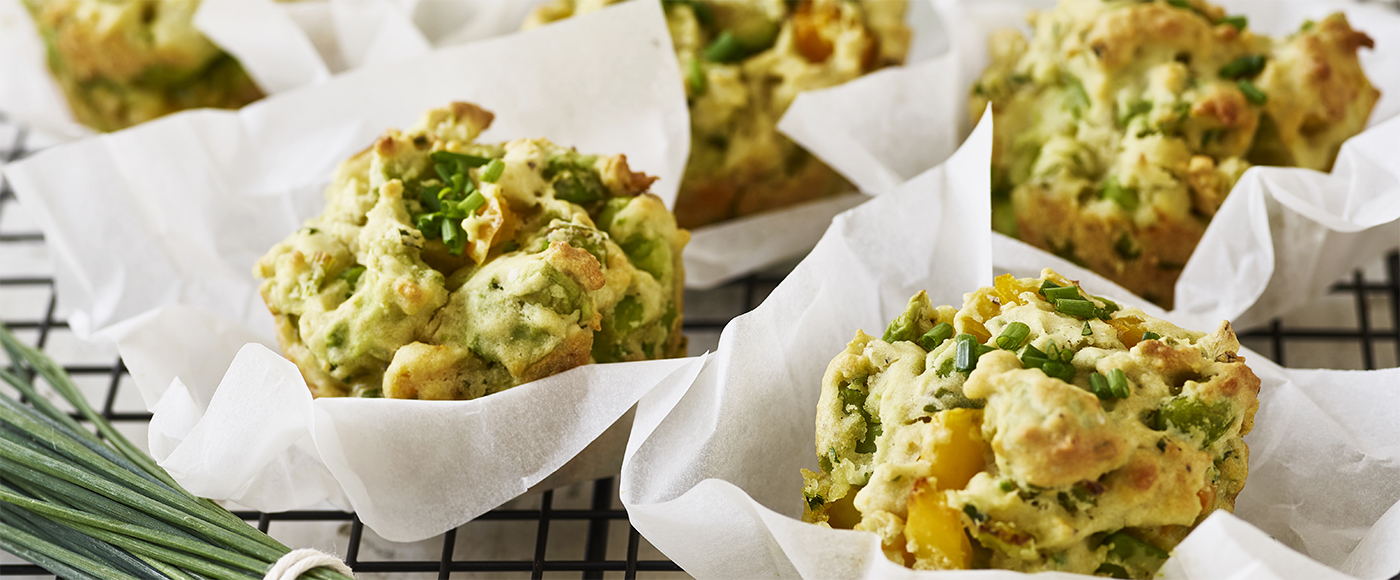 Morgenmuffins med avocado, peberfrugt, edamame og purløg