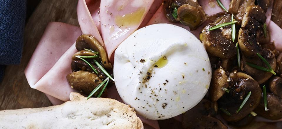 Anret mortadella på et fad sammen med stykker af mozzarella.