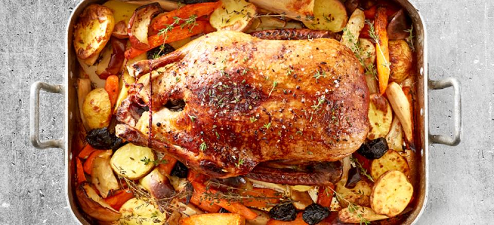 Vend anden og lad den stege videre i ca. 1,5 time med kartofler og rodfrugter i bunden.