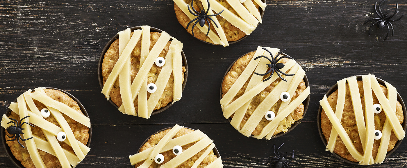 Læg dem på kryds og tværs over tærterne, og pynt med øjne.