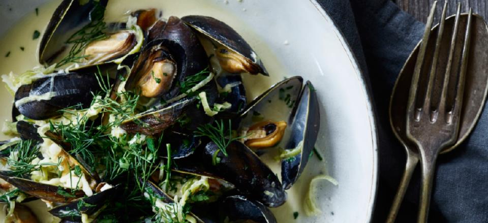 Kom muslinger, hvidvin og fløde i og vend det rundt.