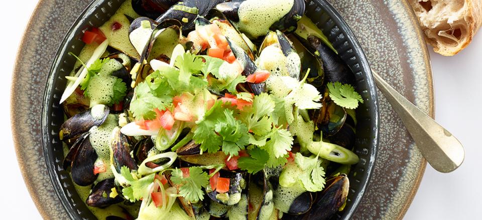 Server straks de varme muslinger i kokossuppen og med godt brød til.