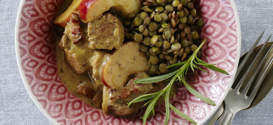 Kom kødet tilbage i gryden og tilsæt æblemost og rosmarin.