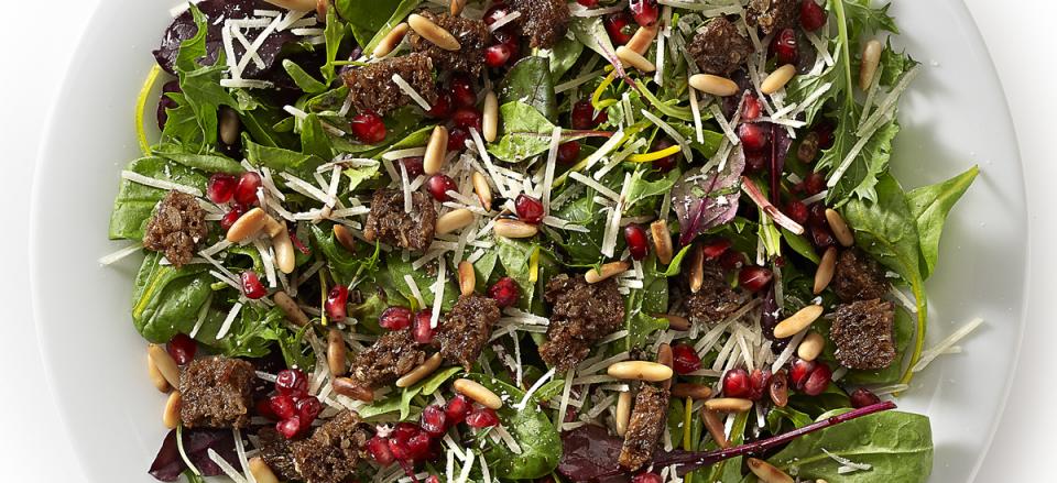 Anret på 4 tallerkener eller stort fad, Napolitana Grande, rugbrødstern, revet parmesanost, granatæblekerner og pinjekerner.