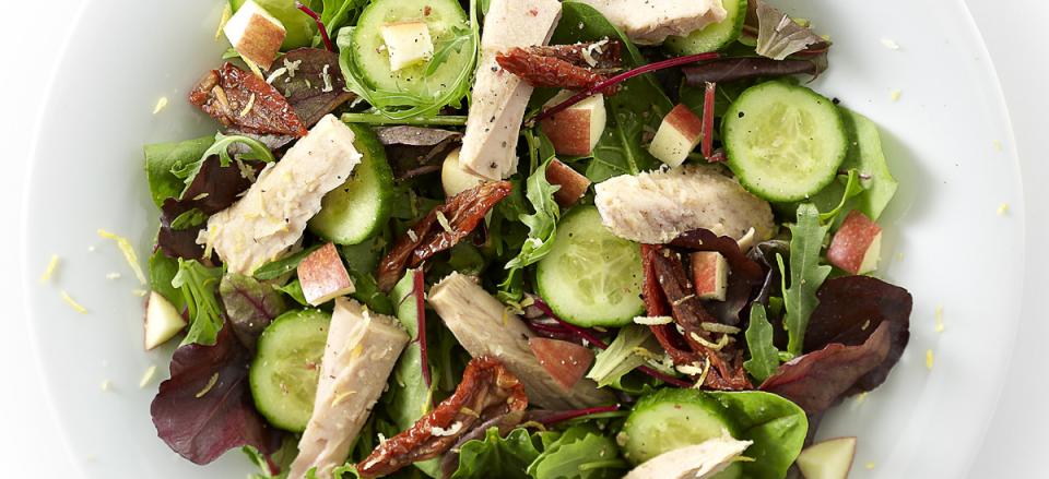 Anret 4 store tallerkener med Napolitana Grande salat i bunden, stykker af tun, agurkeskiver, soltørrede tomater og æbletern.