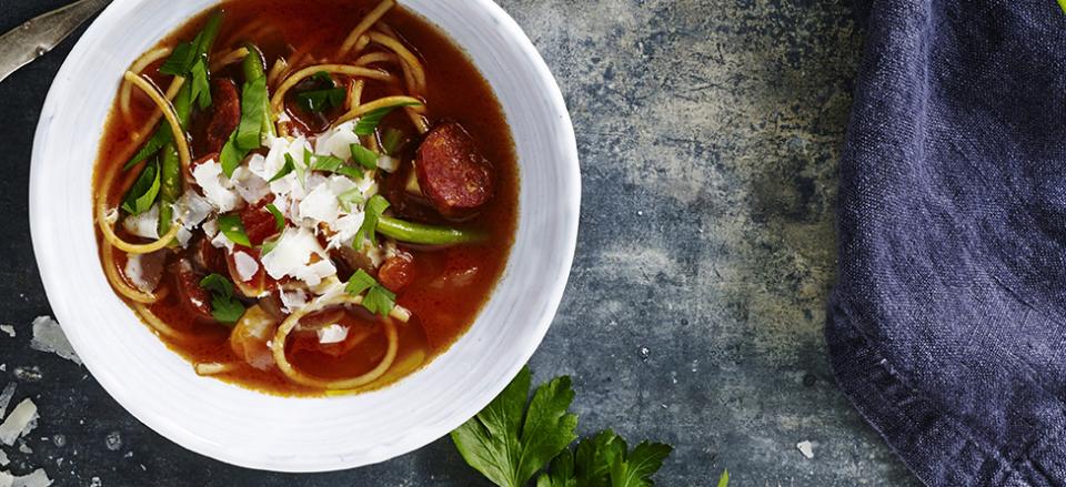 Nem minestrone med chorizo, bønner og pasta