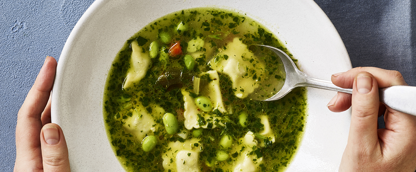 Nem pestosuppe med ravioli og edamamebønner