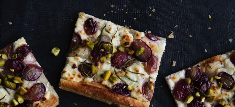 Halver vindruerne, vend dem i honning og fordel dem over gedeosten.