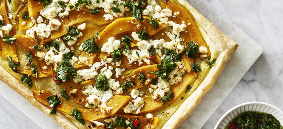 Skær græskarret i tynde skiver og vend med olivenolie, salt og peber.