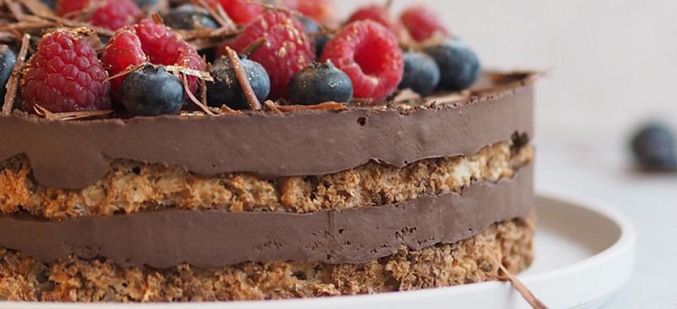 Placer den anden nøddebund herpå og smør det sidste chokolademousse på bunden.