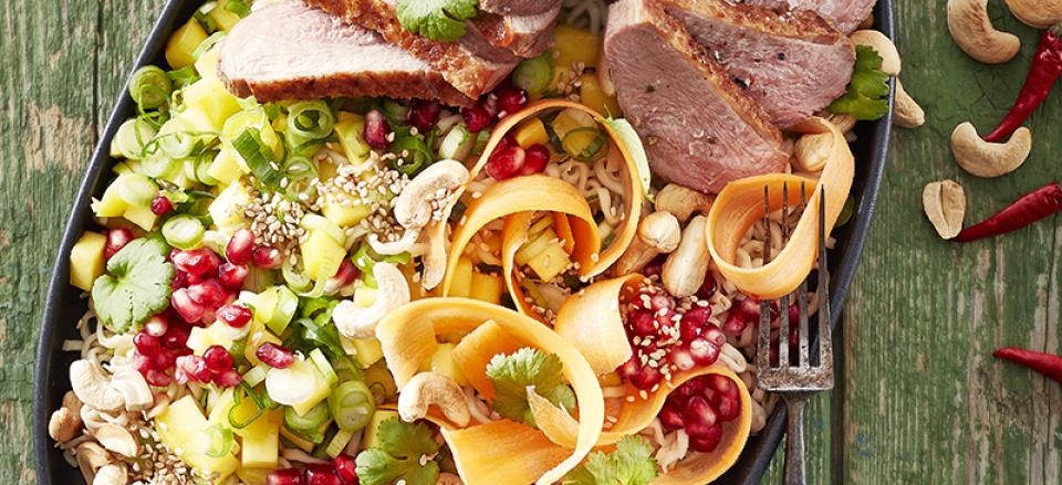 Nudelsalat med glaseret andebryst