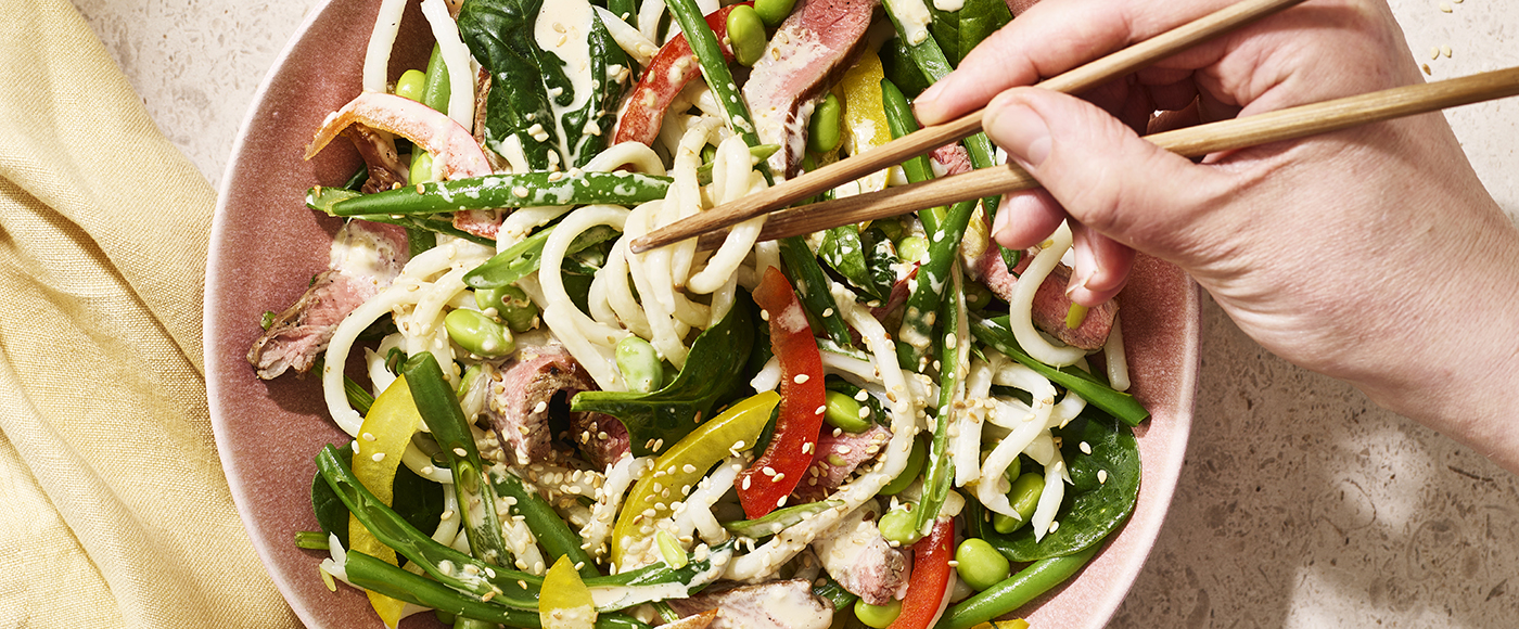 Nudelsalat med sesamdressing og rester af grillet kalv og bønner