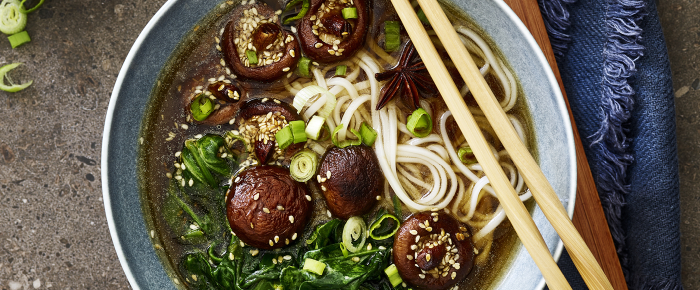 Kog nudlerne efter pakkens anvisning, og kom dem i suppen sammen med svampene.