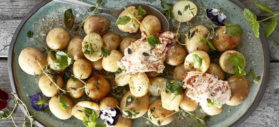 Nye kartofler med krydderurter og rørt friskost