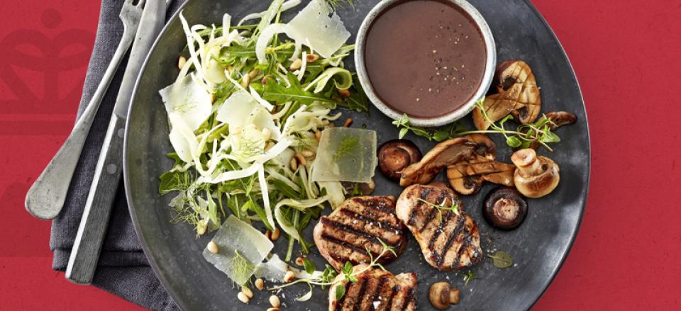 Servér de grillede mørbradbøffer med fennikelsalat, sauterede svampe og rødvinssauce.